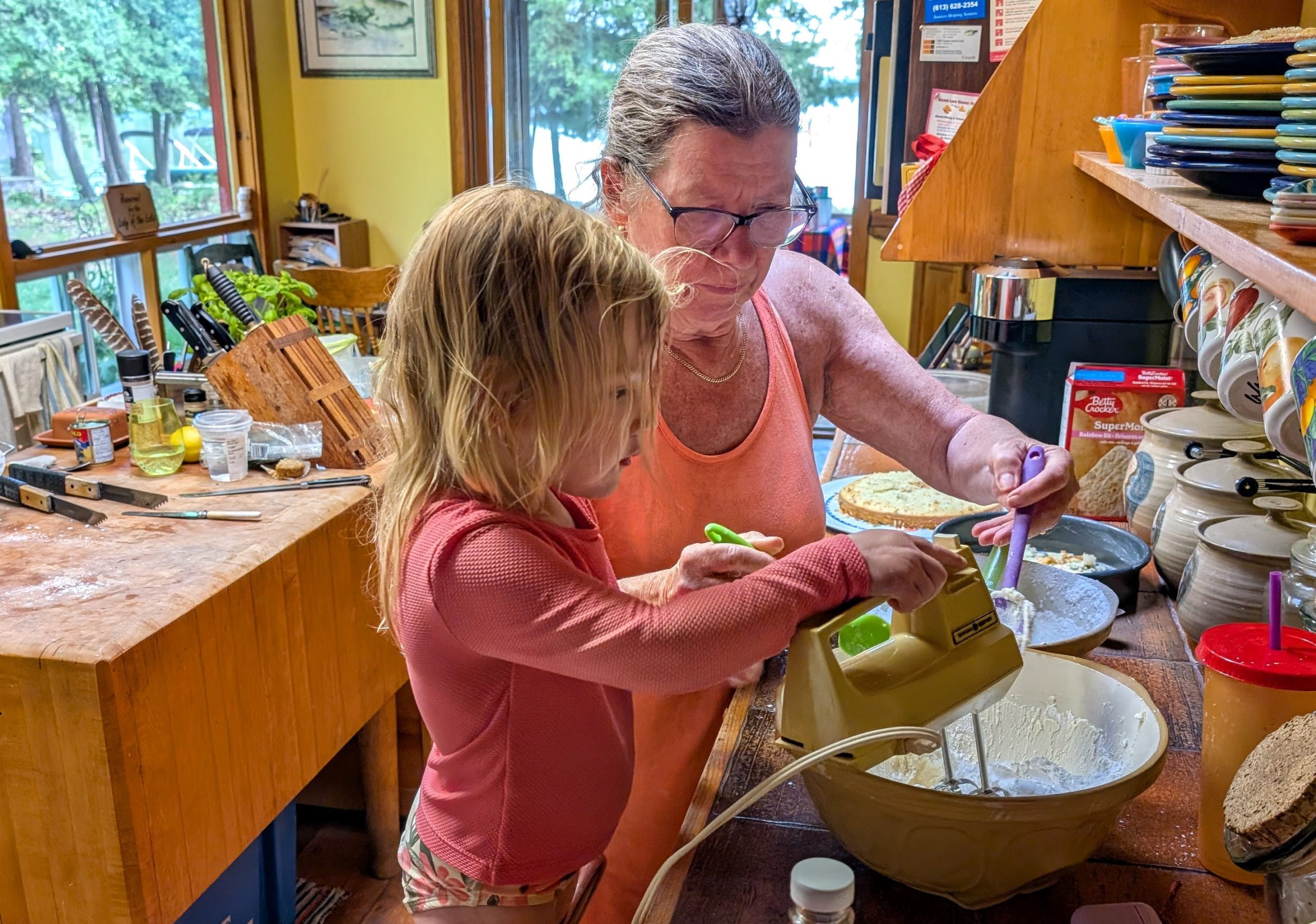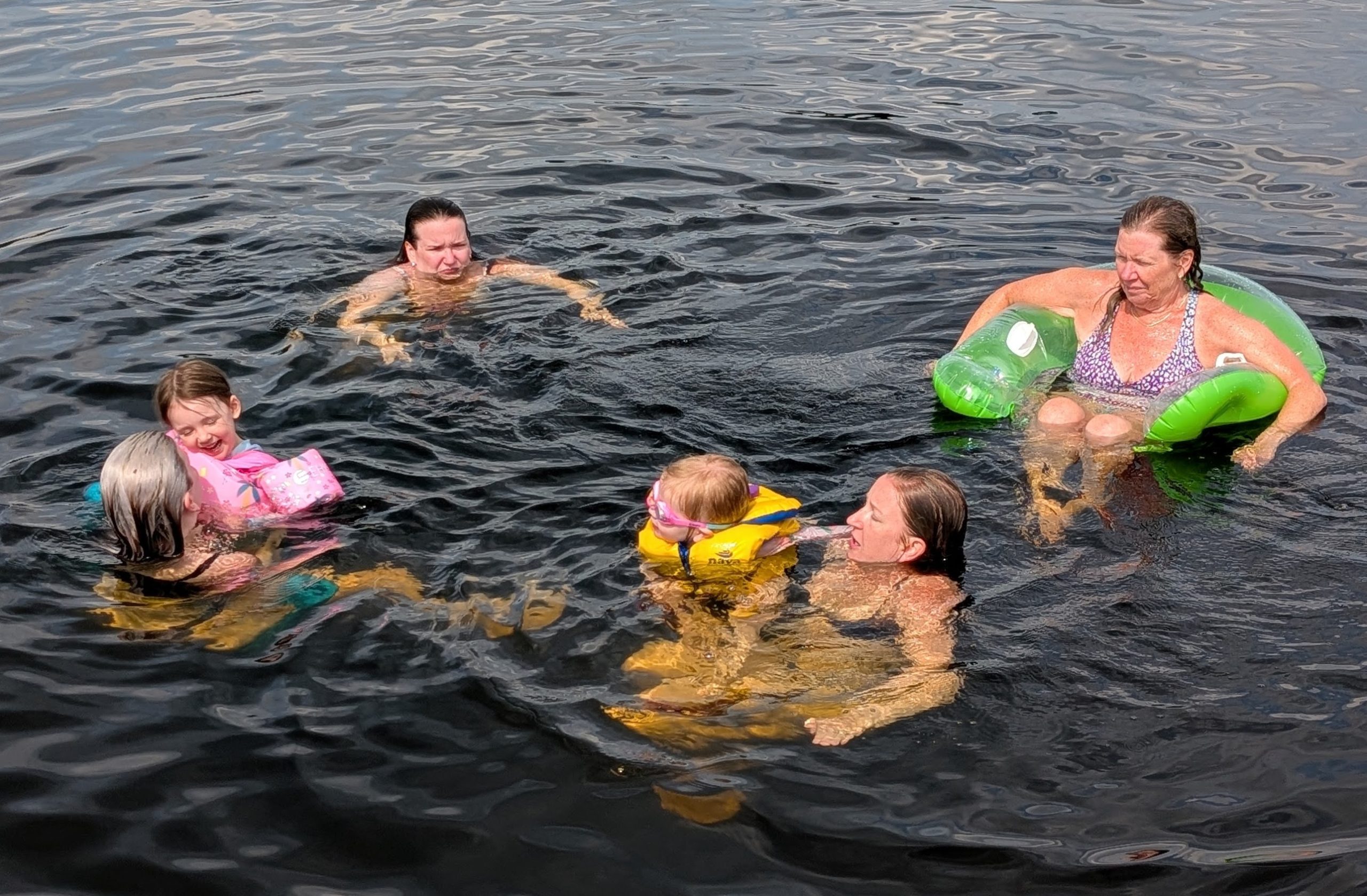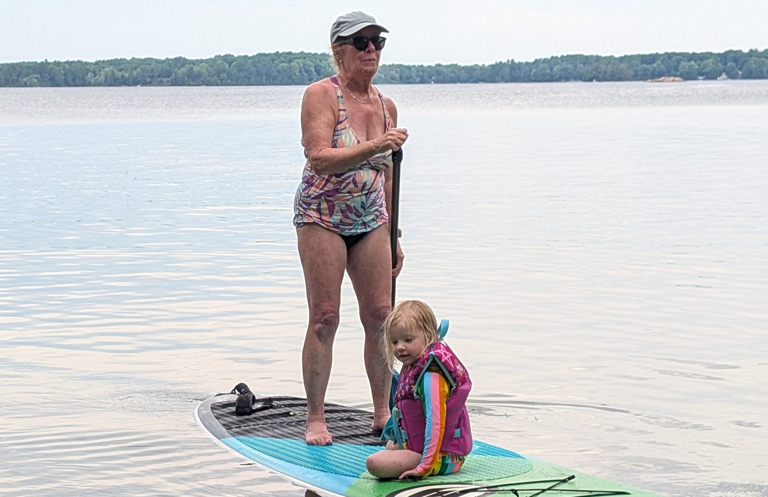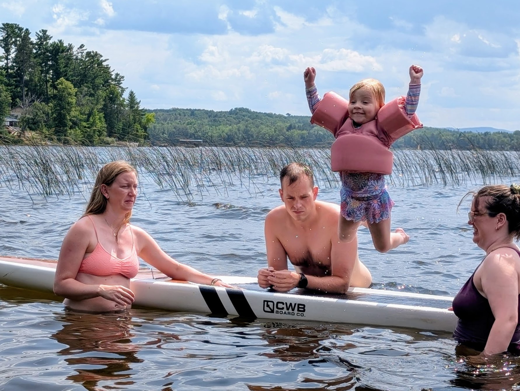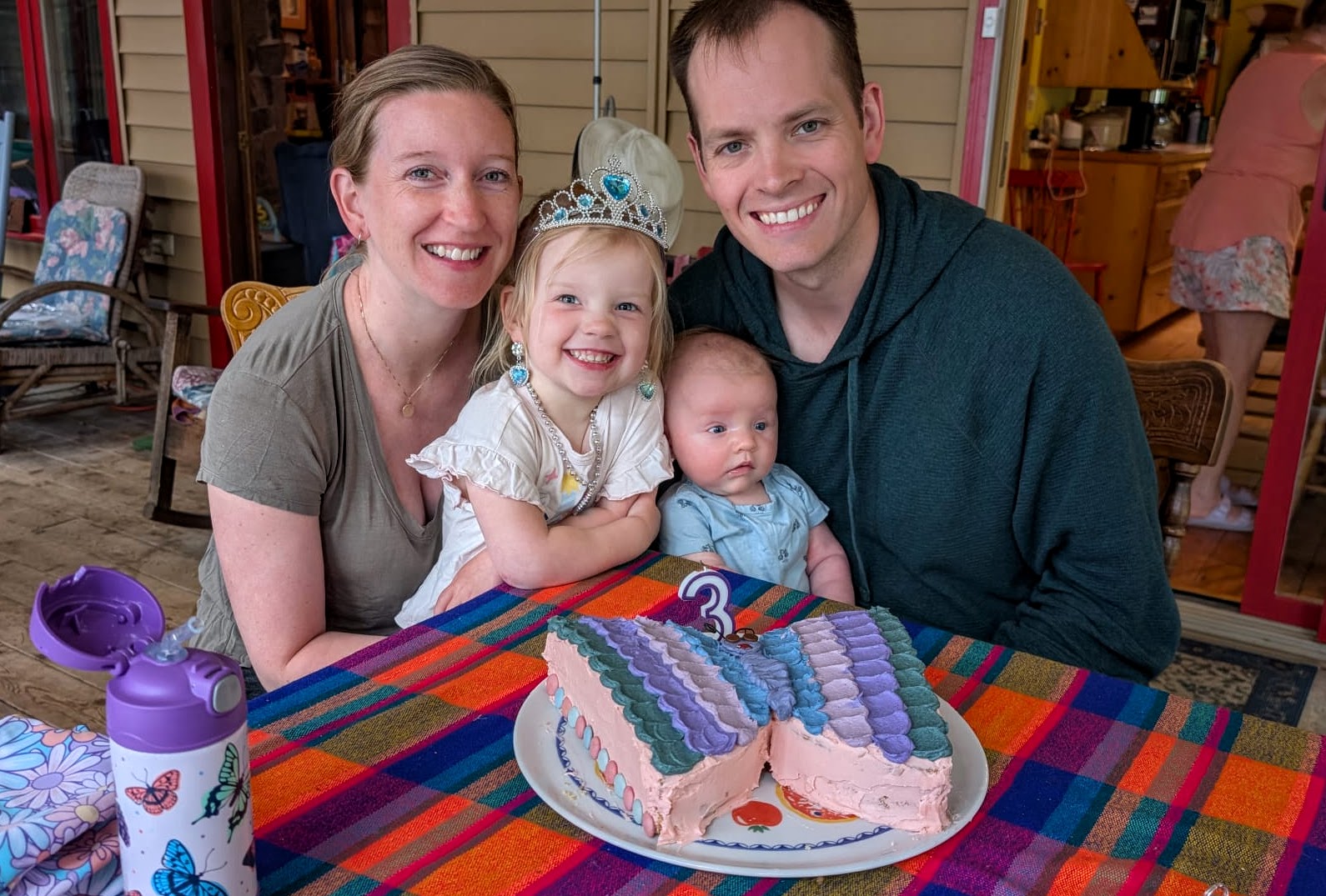 After Otter Lake the summertime began in earnest, and thanks to Caitlin's generous maternity leave policies, we had her and Quinn and Casey and even Wade for a stretch of several weeks in a row, which was fantastic. And unlike previous years -- where the "nurse curse" often meant cold and/or wet weather -- we had some pretty amazing weather. Quinn got brave at Otter Lake after seeing the older girls jumping off the paddleboard in the shallow water and so she spent a lot of the summer doing exactly that at our cottage, until she was leaping in the air and going under the water with her head fully submerged for a surprisingly long time! As is traditional with new members of the family, Casey had a bath in the kitchen sink (we gave Jack a bye on this tradition for obvious reasons) and Quinn helped Grandma make a cake, and then it was time for Quinn to turn three whole years old! Wade spent hours making a butterfly cake that he saw on Instagram and Quinn wore her birthday crown and her Elsa dress and it was fantastic. And there was lots of time for Quinn and I to sit looking out at the lake and reflect on how great life is at the cottage, and ride bikes and run up and down the dock and go for boat rides and play hide-and-seek in the popup trailer we bought this year for overflow sleeping. Quinn and I drew hopscotch patterns on the driveway with chalk, and Becky read books with Quinn on the porch, and Wade read books with Casey and Quinn hugged her new brother a lot and hugged her dad, and Meaghan read books with Quinn and her cousin Ophelia, and Becky and Caitlin held Casey in the lake and he even floated around in his very own floaty and seemed very chill and relaxed.