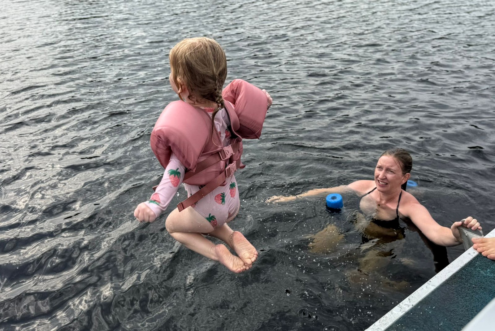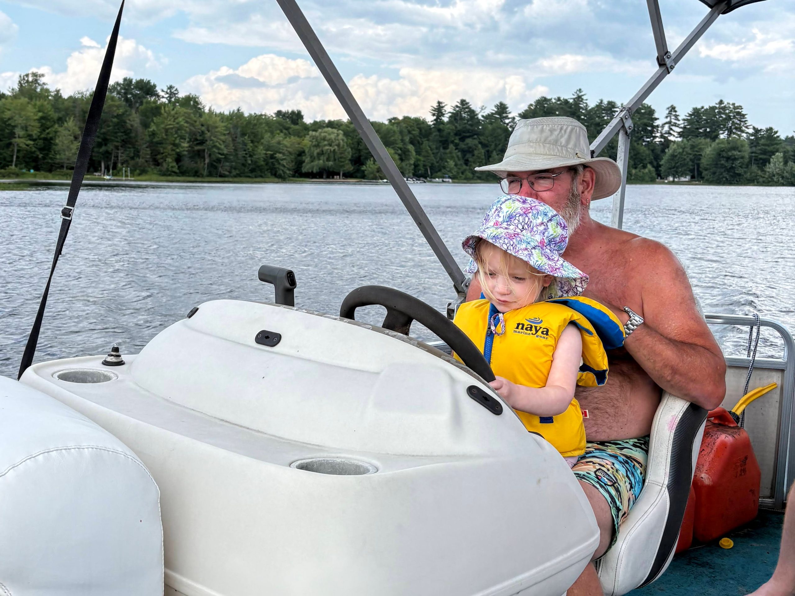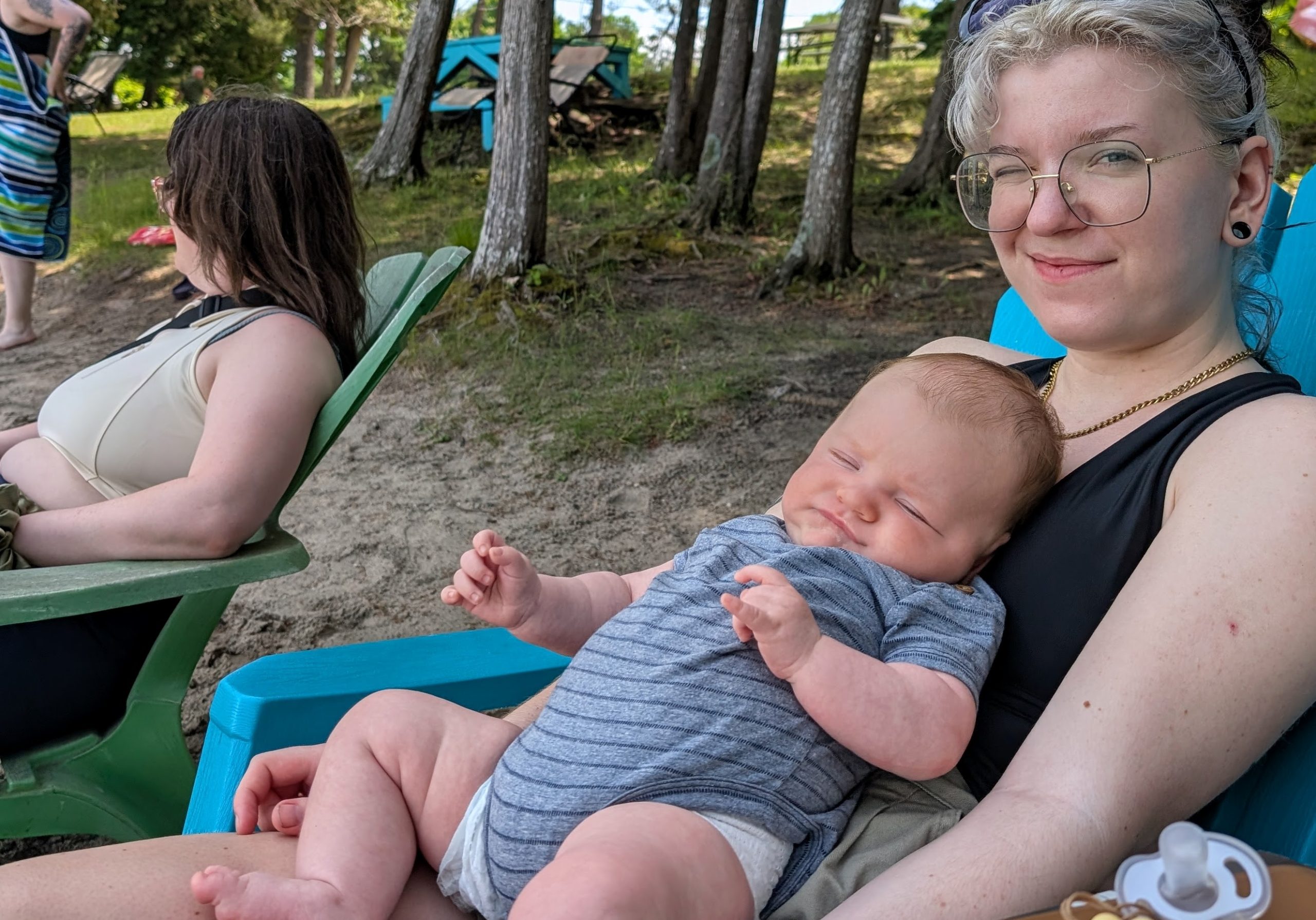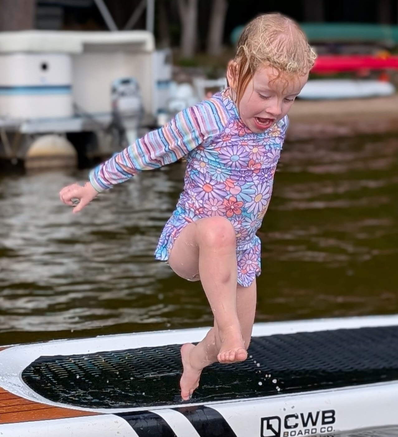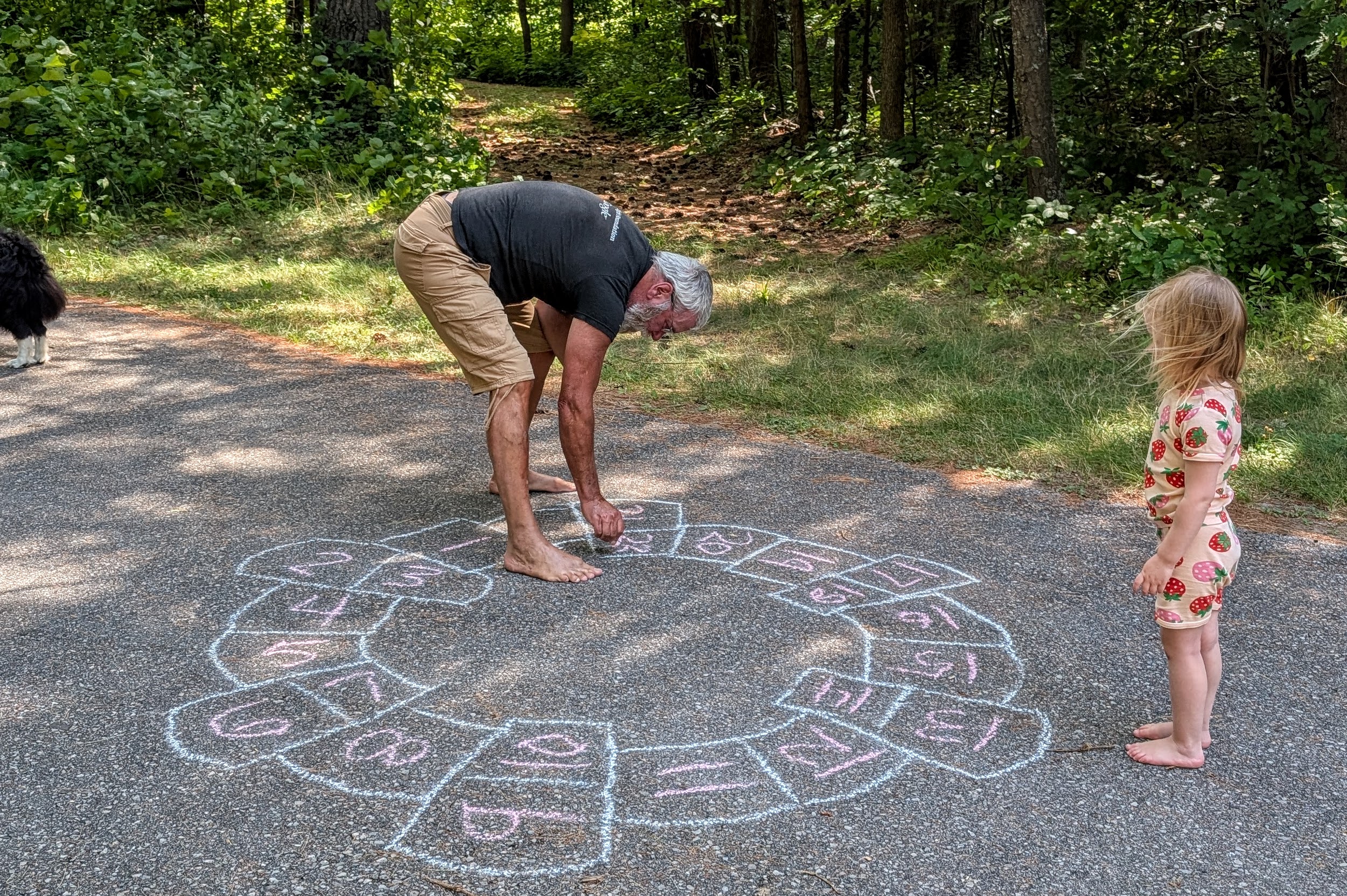 After Otter Lake the summertime began in earnest, and thanks to Caitlin's generous maternity leave policies, we had her and Quinn and Casey and even Wade for a stretch of several weeks in a row, which was fantastic. And unlike previous years -- where the "nurse curse" often meant cold and/or wet weather -- we had some pretty amazing weather. Quinn got brave at Otter Lake after seeing the older girls jumping off the paddleboard in the shallow water and so she spent a lot of the summer doing exactly that at our cottage, until she was leaping in the air and going under the water with her head fully submerged for a surprisingly long time! As is traditional with new members of the family, Casey had a bath in the kitchen sink (we gave Jack a bye on this tradition for obvious reasons) and Quinn helped Grandma make a cake, and then it was time for Quinn to turn three whole years old! Wade spent hours making a butterfly cake that he saw on Instagram and Quinn wore her birthday crown and her Elsa dress and it was fantastic. And there was lots of time for Quinn and I to sit looking out at the lake and reflect on how great life is at the cottage, and ride bikes and run up and down the dock and go for boat rides and play hide-and-seek in the popup trailer we bought this year for overflow sleeping. Quinn and I drew hopscotch patterns on the driveway with chalk, and Becky read books with Quinn on the porch, and Wade read books with Casey and Quinn hugged her new brother a lot and hugged her dad, and Meaghan read books with Quinn and her cousin Ophelia, and Becky and Caitlin held Casey in the lake and he even floated around in his very own floaty and seemed very chill and relaxed.