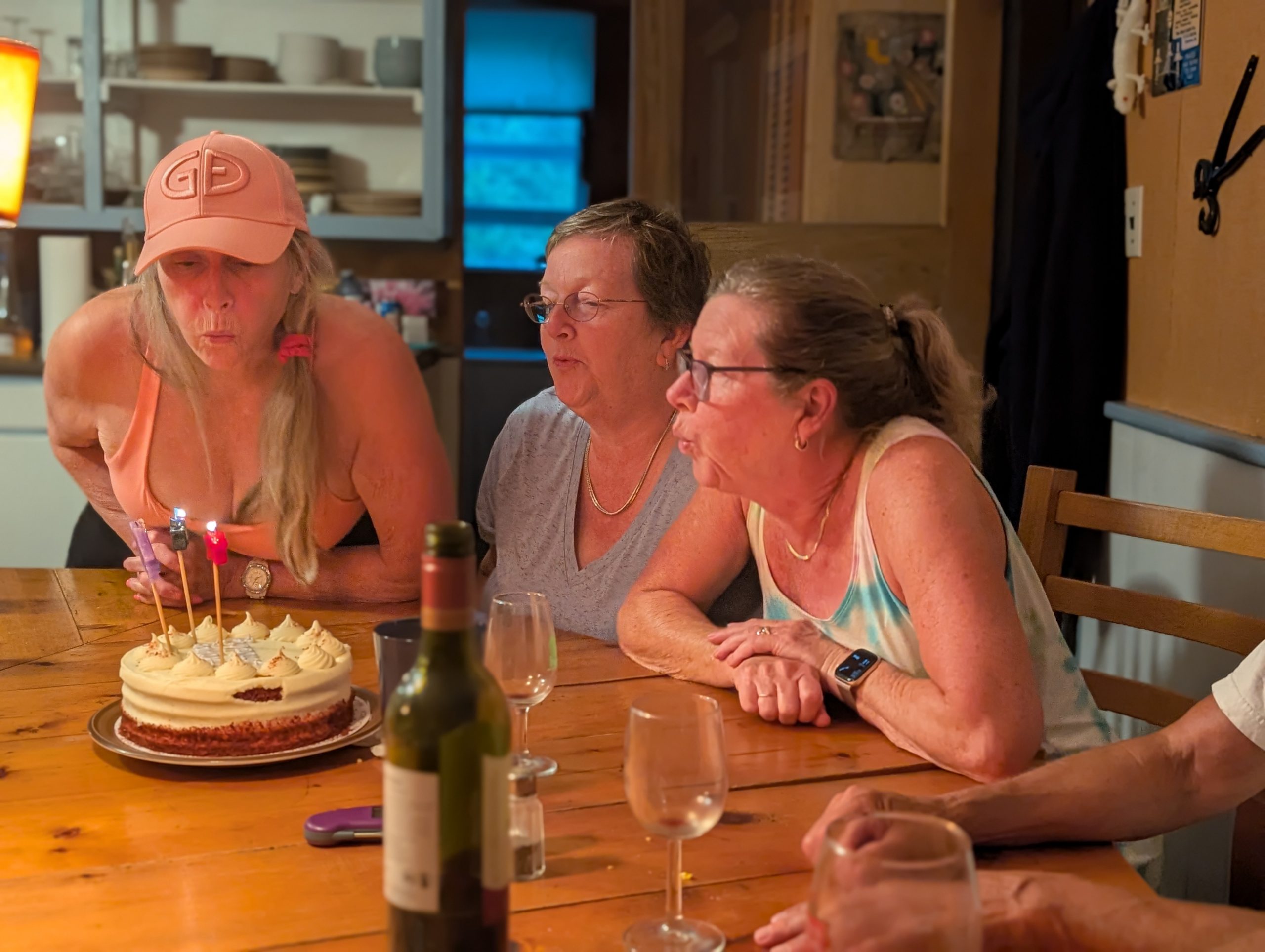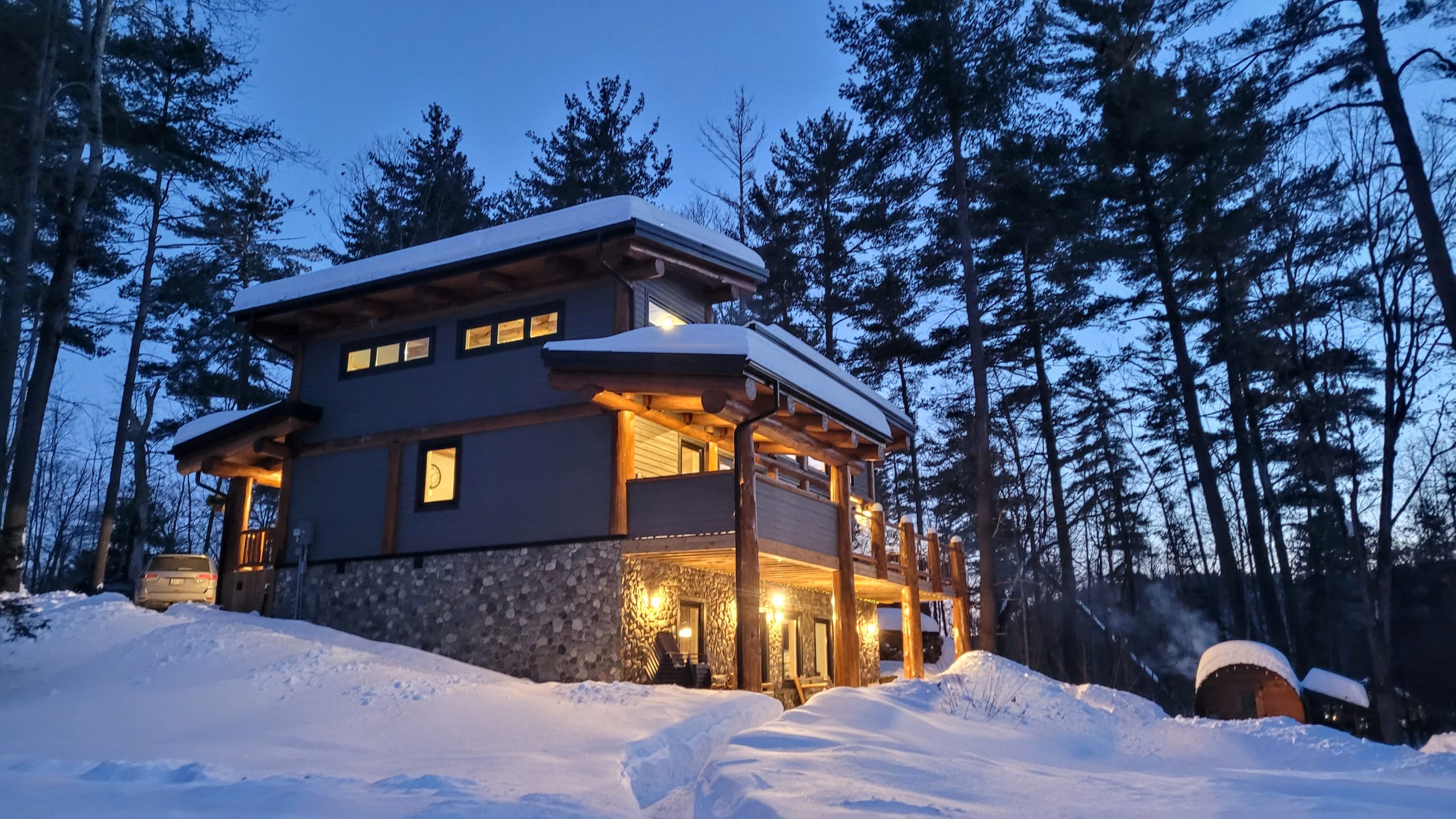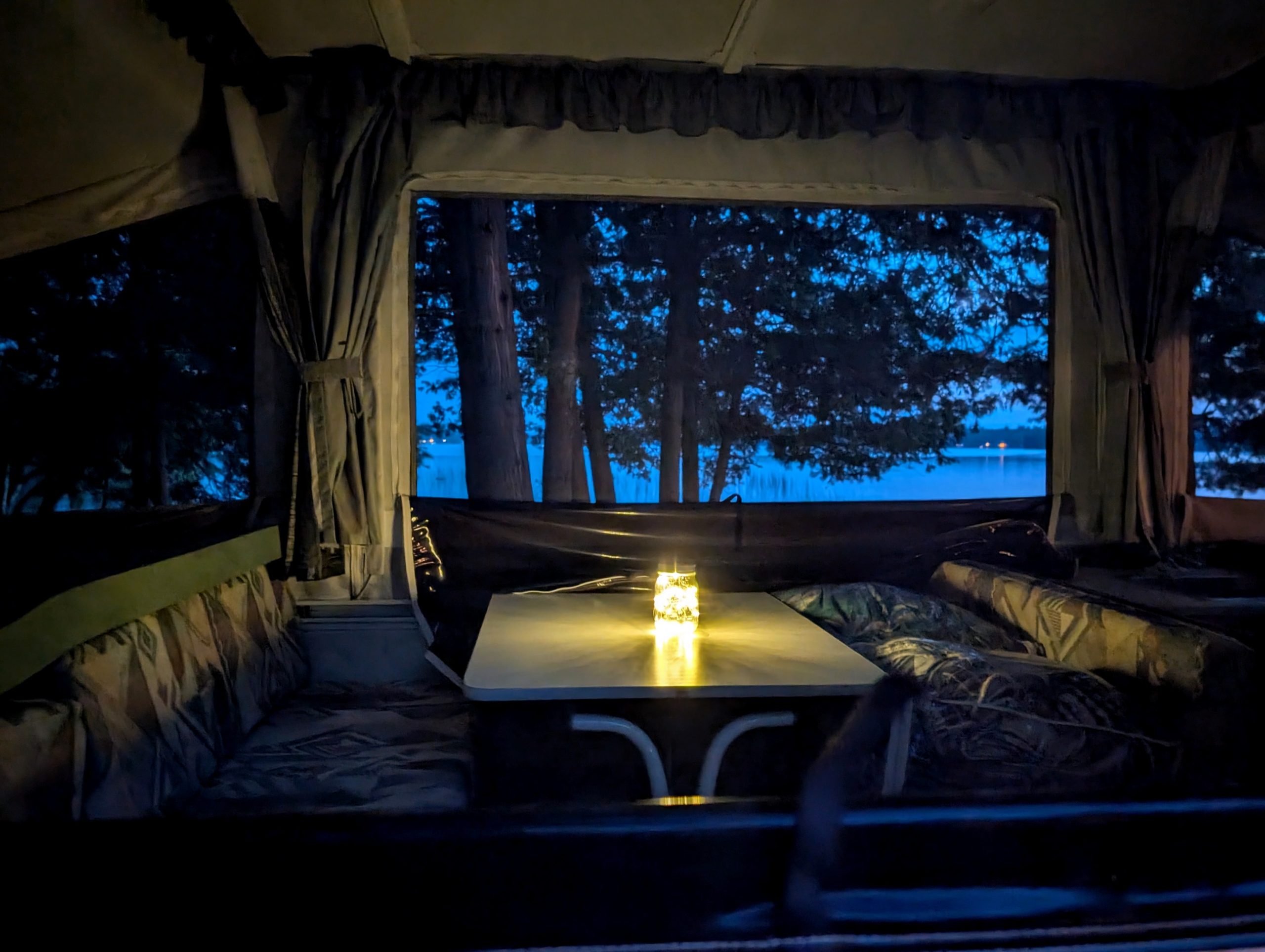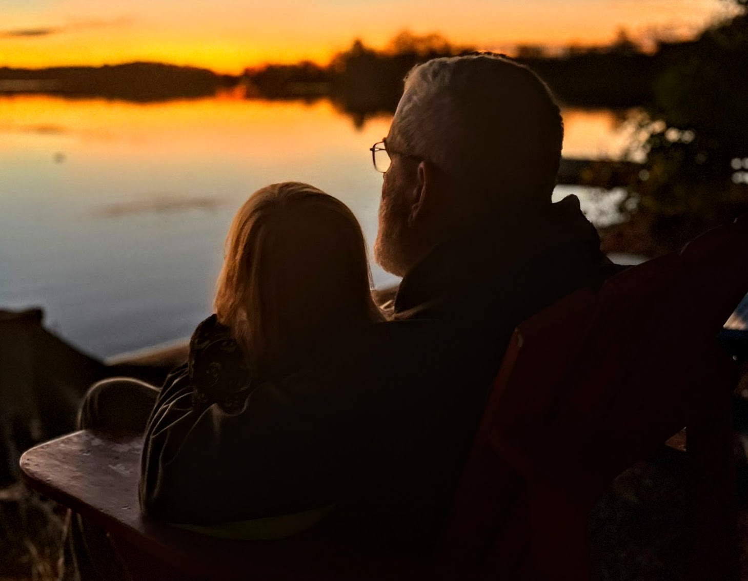 August brought the usual reunion of old university friends at the Farm, but this one had a twist: several of our members had turned 65 recently, including young Becky, so there was a cake and much merriment. In September, Becky and I went backwoods camping as we have done for many years now, but this time we decided to take it easy on our old bones and we only did one short portage instead of three long uphill ones :-) We had a lovely time on this tiny lake, and went for a great hike, and had a beautiful afternoon at our campsite -- which had the single largest collection of firewood I have ever seen that was obviously left by some kind person prior to us, and they even used their whittling skills to make some pioneer furniture from logs, which I used to eat dinner at. Unfortunately for us, there was a fire ban due to weeks of no rain, so all that wood went for naught. Back at the lake there was lots of time for sunsets and cruises on the pontoon boat, and jumping off and floating around in the bay. At Wade's family cottage up near Parry Sound, Quinn went tubing behind a motor boat with her cousins for the first time! Becky and I and a bunch of friends went to visit a friend who lives in Muskoka and we had some great food and a singalong by the bonfire, and our friend Kathy and I went kayaking on Lake Rosseau, and I had a brain fart and managed to forget to tie the kayaks down on the car for the return trip, so one came off as we drove down the road :-) Luckily it didn't hit anyone, it just wound up in some nice lady's front yard, and only had a couple of little dents. Remember everyone, always check that your kayak is strapped down before you drive away! LOL. Later in the fall we had a full moon so bright that you could almost read a book on the beach at midnight (I didn't though) and the photos make it look like I used some kind of bright filter but that's exactly what it looked like.